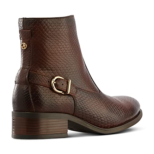 A sleek pointy toe ankle boot has a luxe look with Italian two-tone finish on embossed napa leather. Gold ankle buckle lends an upscale touch with stacked effect brown heels. MITA is a versatile style that can be worn with everything in your closet from jeans to maxi dresses.