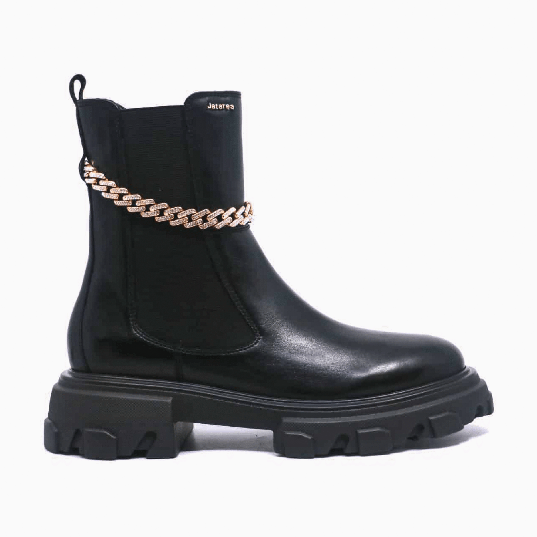 Step into the edgy style of the PARUL Chelsea Boot. This boot features a chunky sole and premium leather, with a pull-on tab and elastic sides for a snug and comfortable fit. It also comes with a removable rhinestone-embellished gold “shaftlace” for added flair. Wear the “shaftlace” on either boot for a cool, unique look.
