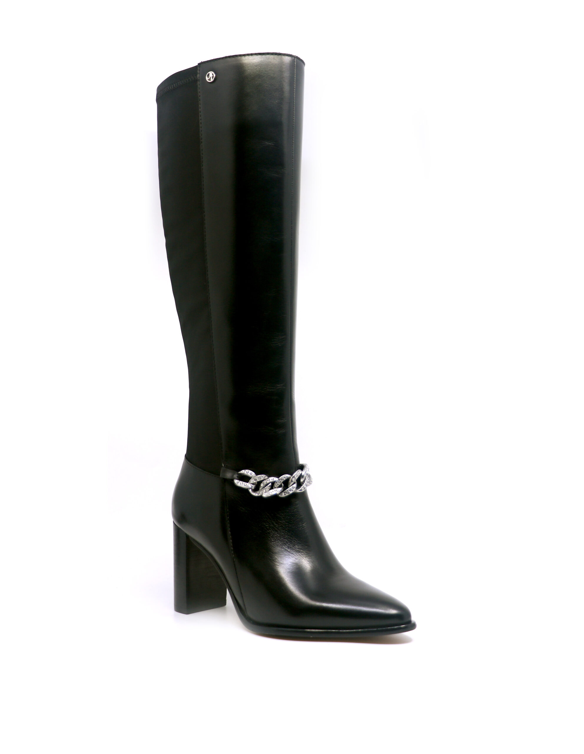 Upgrade your style with the SHEFALI tall boot. Designed with a pointed toe, premium leather upper with flexible back panel, rhinestone-embellished chain & slick stacked heel this standout silhouette pairs beautifully with slim pants or a sophisticated dress for a refined, polished appearance. Count on them to keep cold legs covered up and cozy all season.